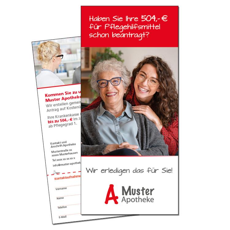 Hochformatflyer individuell aufbereitet mit Apothekenfoto, Logo und Kontaktdaten und einem Rabattgutschein für Pflegehilfsmittel.
